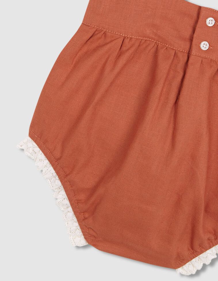 Ranita con lino de tirantes con bordados en la cintura. abotonada en la espalda y en el tiro.